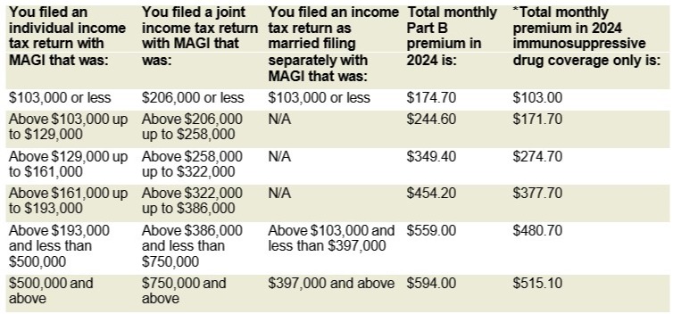 Premium for those with higher incomes: If your modified adjusted gross income (MAGI) as reported on your federal income tax return from two years ago (2022) is above a certain amount, you'll pay the standard premium amount and an Income-Related Monthly Adjustment Amount (IRMAA), which is an extra charge added to your premium, as shown in the following chart.